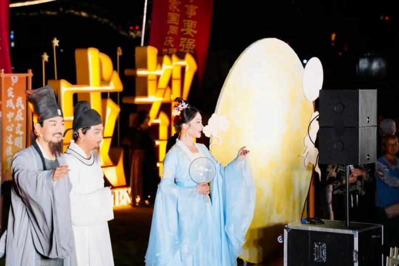 湖畔灯光喷泉精准联动节目进程,水流随节目旋律起落,灯光映照下的水幕与月色、屋檐光影相映,为中秋夜增添灵动浪漫;《但愿人长久》的旋律响起时,全场轻声跟唱;沉浸式汉服秀《汉韵檐下·中秋赋》更让人身临其境,仿佛穿越千年;诗词飞花令与“盲盒探月”互动满是惊喜,“明月几时有”“天涯共此时”的诗句轮番登场,老少观众都参与其中,感受文字里的中秋意趣。