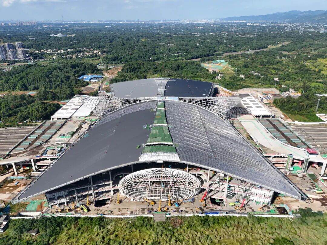 当前,天府站正处于金属屋面装饰层(凤羽)施工、外幕墙施工、室内装修及机电安装全面施工的关键阶段,各工序衔接紧密。国庆期间,施工现场每天有近800名建设者奋战在岗位上,他们分布在屋面、南立面幕墙、出站层、高架层、配套市政设施等多个作业面,有条不紊地推进各专业、各区域施工任务。