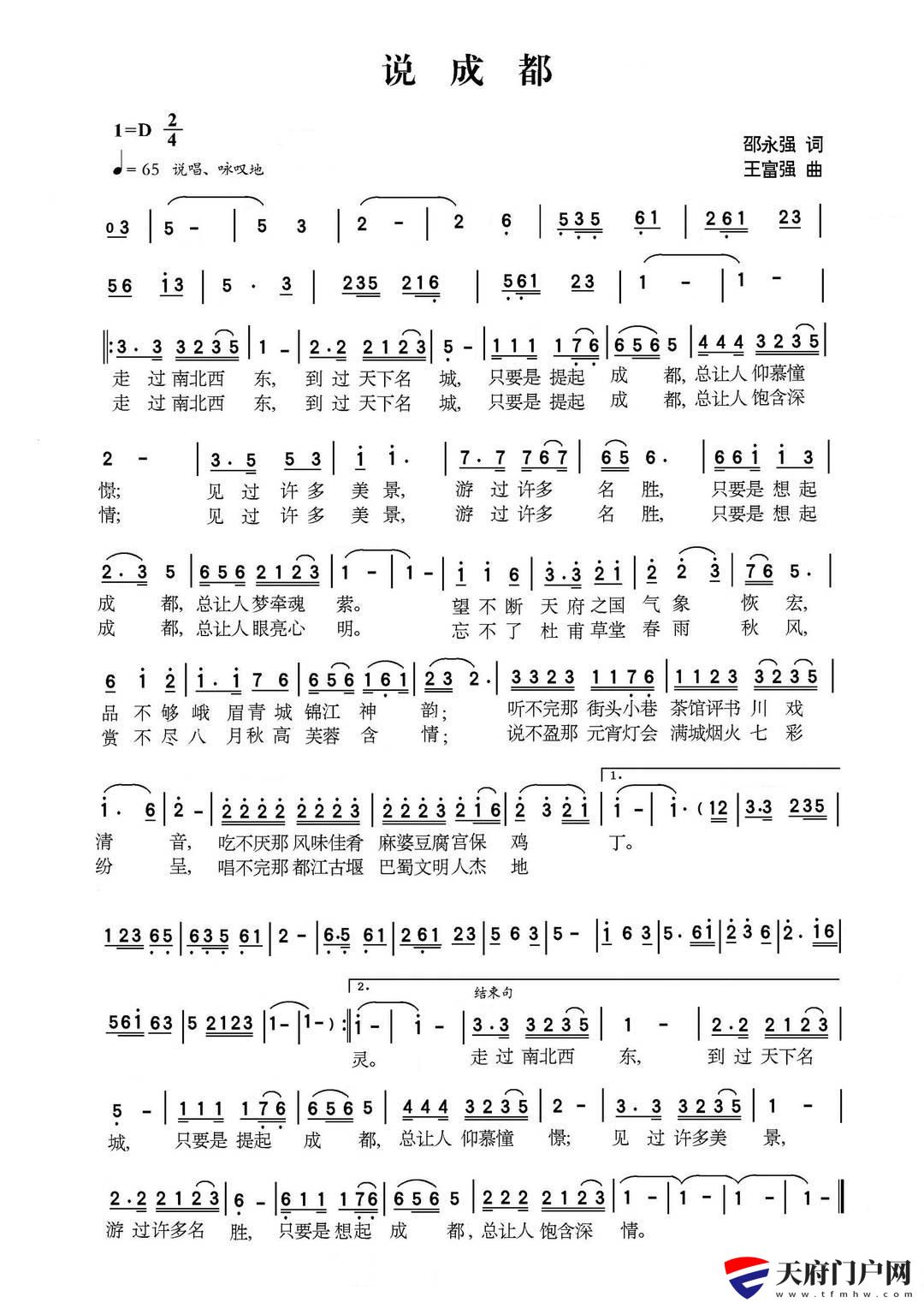 《说成都》词作以杜甫草堂、都江古堰、武侯祠、茶馆评书、麻婆豆腐等极具成都标识的意象为脉络,将历史纵深与市井烟火巧妙交融,字里行间满是对巴蜀沃土的眷恋。