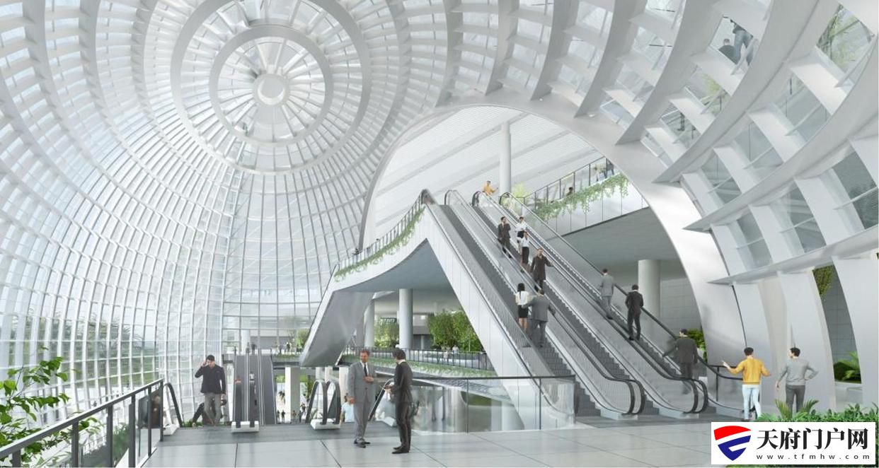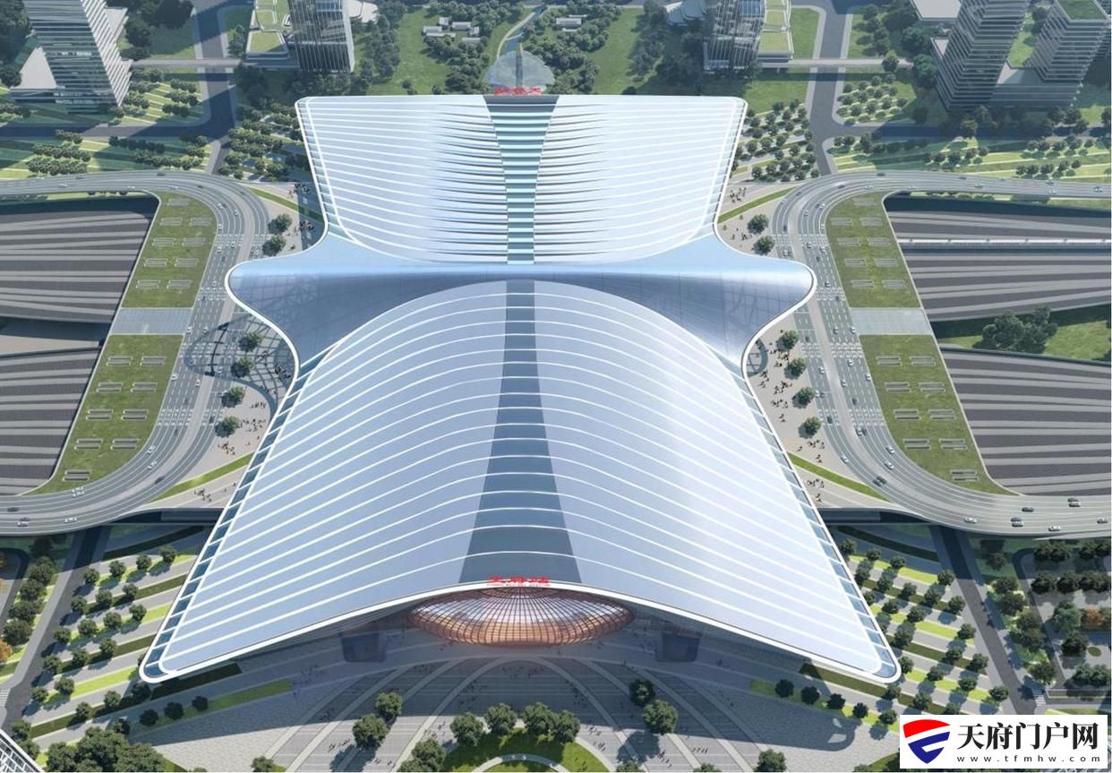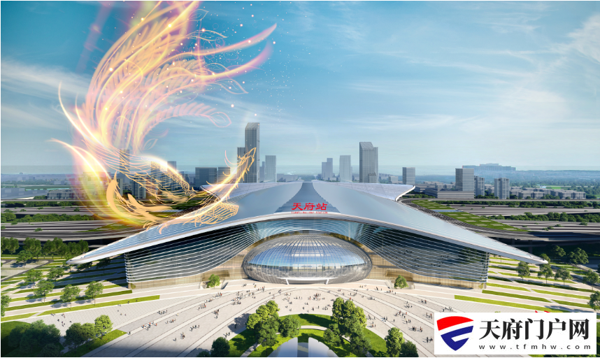 据悉,天府站以“筑巢引凤”为设计理念,形态上采用了大量的曲线元素,造型设计现代新颖、优雅连续:鸟瞰效果如振翅欲飞的凤凰栖停于站场之上;立面以横向的铝合金线条凸显建筑的舒展感,端部的综合换乘大厅——凤凰之眼和腰部的光谷雨棚成为了各自立面的视觉中心。