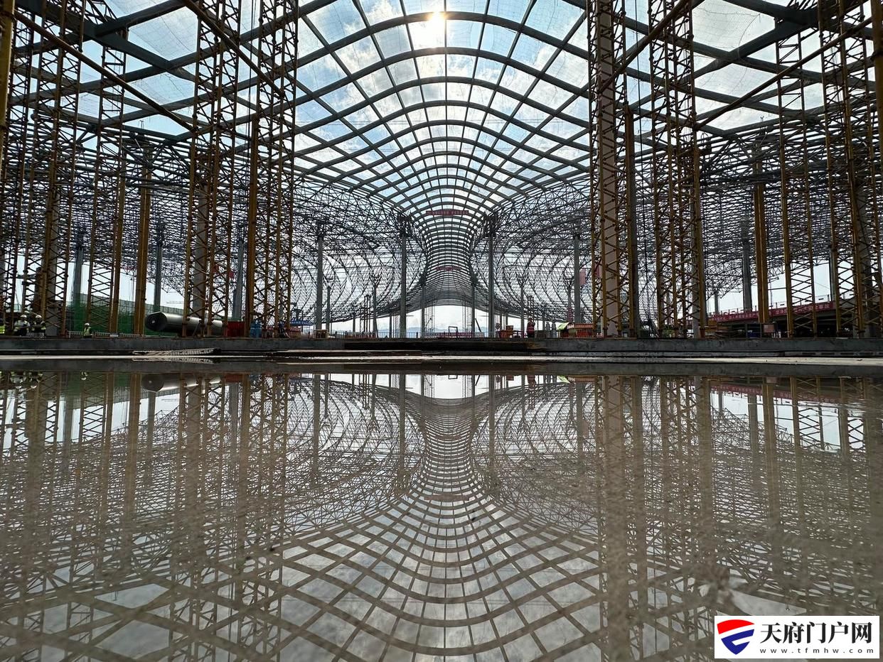 据中铁建设公司天府站项目副总工谢建乐介绍,目前已完成站房屋面钢结构网架整体提升工作,正在进行南测试站房的主体结构施工工作。下一步,将全面转入屋面膜结构施工及内部装饰装修阶段。